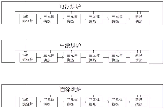 TAR系统是每条烘干室设一个焚烧炉,有机废气通过焚烧后,经过多个三元体换热后,最终排空废气温度较低,余热充分利用,节能。烘干室供热由三元体换热提供。